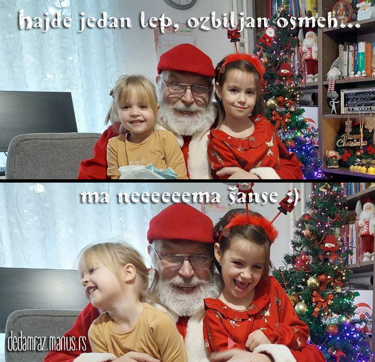 Neka deca, u uzrastu od 2–4 godine, ponekad loše reaguju na ogromnog, debelog, bradatog dedu u crvenom i neće da priđu. NEMOJTE insistirati na tome. Pokušaćemo svi zajedno da strpljivo i polako, bez nervoze, odobrovoljimo dete da se poigra sa mnom, ali nema garancije da ćemo uspeti. Ništa strašno, dešava se, biće i drugih Novih Godina, već sledeći put će biti potpuno obrnuta situacija :)